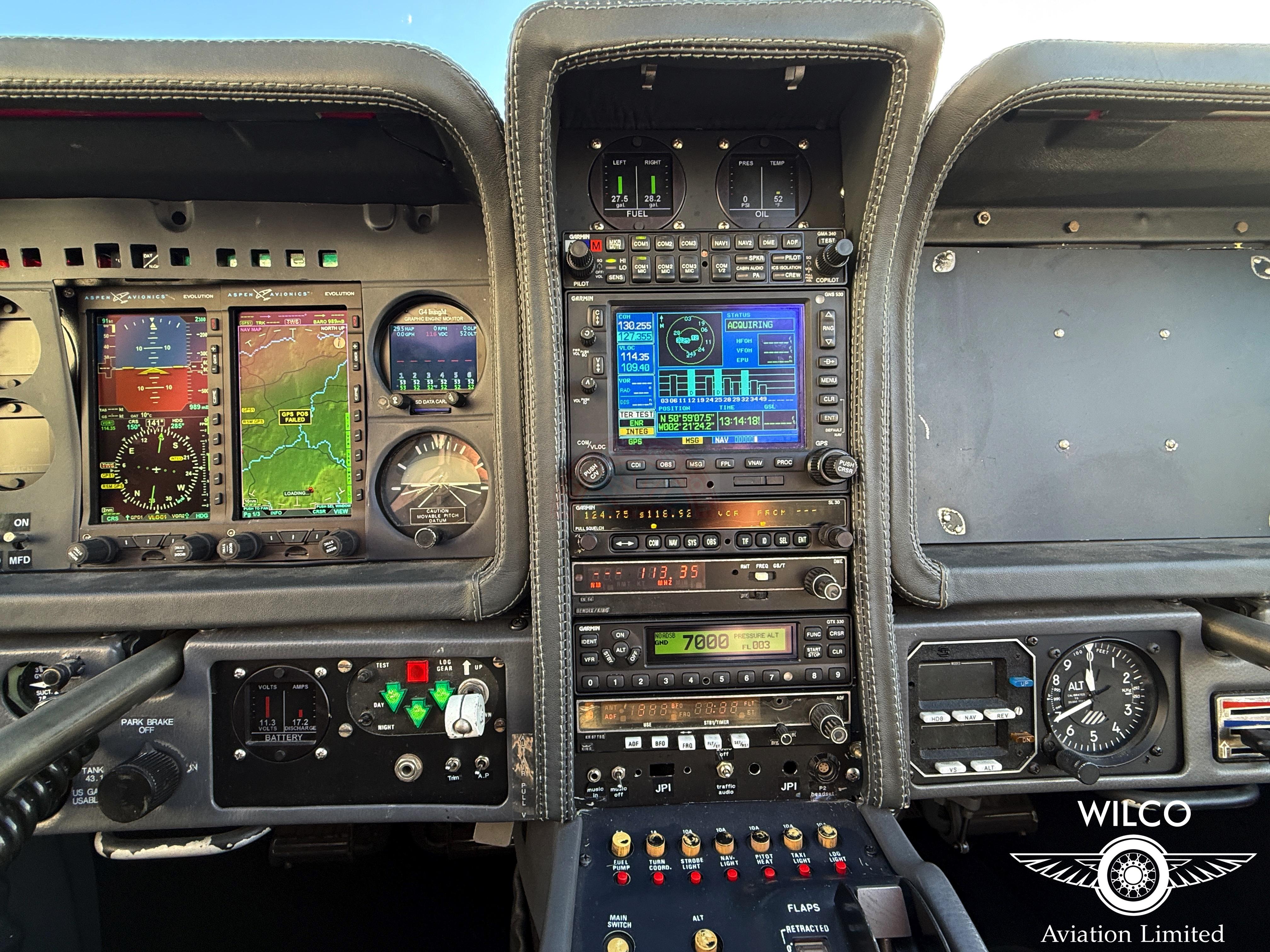 The avionics and equipment fit of N5ZY is both comprehensive and well balanced, offering a capable and reassuring cockpit environment for VFR and IFR operations alike. At the heart of the panel are the Aspen EFD 1000 Primary Flight Display and Aspen EFD 1000 Multi-Function Display, providing a clean, modern presentation of essential flight, navigation and situational awareness information. These displays significantly reduce pilot workload while enhancing clarity and redundancy compared with traditional analogue instrumentation.