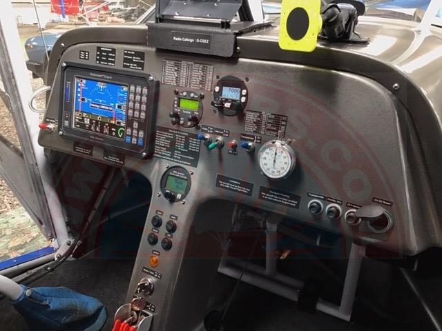 Roomy / Comfortable Cockpit with Dual Control Columns and Dual Throttles, 3-stage Flaps, Toe Brakes, P1 and P2 PTT Radio Buttons, and Excellent Visibility. Recently Refurbished Carburettors and new Fuel Pump. MGL ‘Enigma’ Electronic Flight Instrument System (EFIS) incorporating Compass, Artificial Horizon, ASI, VSI, Altimeter, Slip Ball, GPS, TAS, GS, and Engine Instruments, plus separate Standby ASI and Altimeter; Funke ATR833S Radio with Integral Intercom; Trig TT21 Mode S Transponder; Analogue Stopwatch; 2 Sennheiser HME95 Headsets; and set of aircraft dust covers (for hangar use)