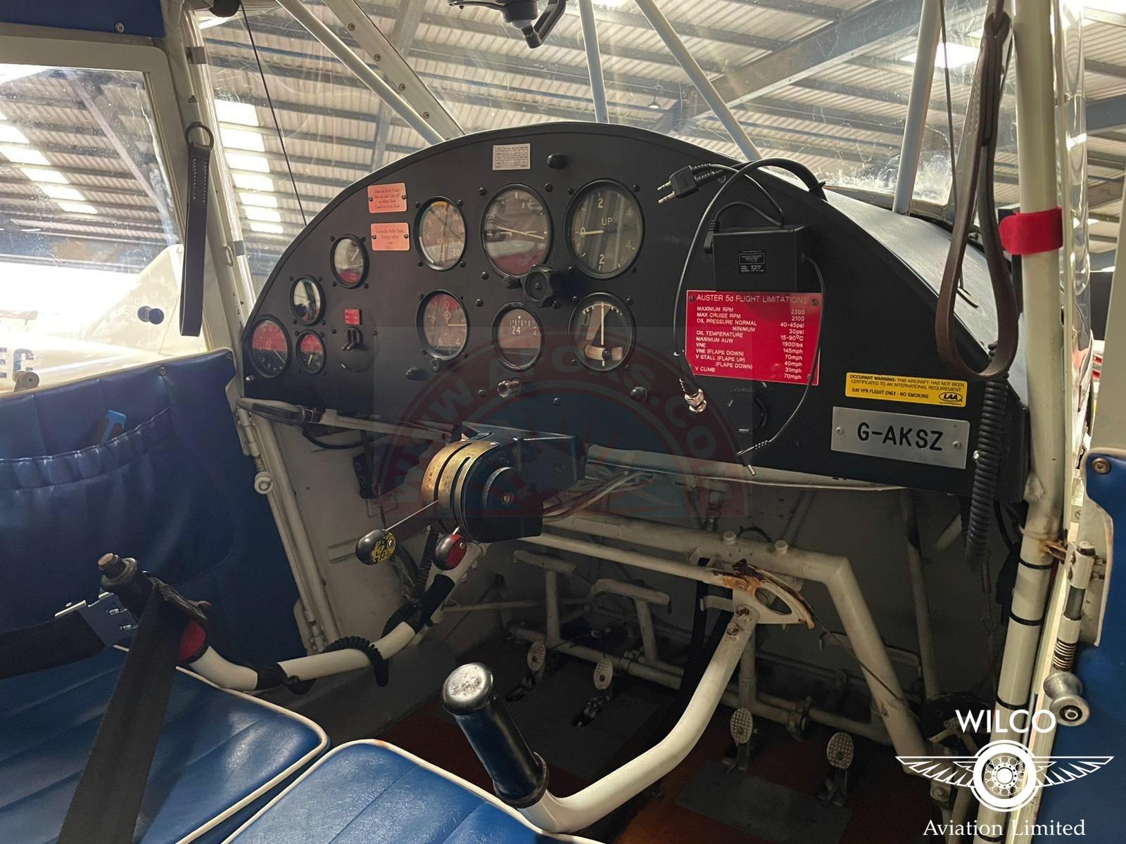 One such example was registered as G-AKSZ. Built to 5D specification, it represented the type in civilian ownership in Britain and contributed to the modest but enduring post-war presence of Auster aircraft in private and club flying. The aircraft is fitted with an auxiliary belly fuel tank with a capacity of 58 litres. The original tanks were manufactured in steel and are often subject to internal corrosion, but in this case an aluminium replacement was produced that is indistinguishable from the original factory item. In addition to the aircraft itself, there is also a separately negotiable spares package which includes two recently refurbished magnetos.