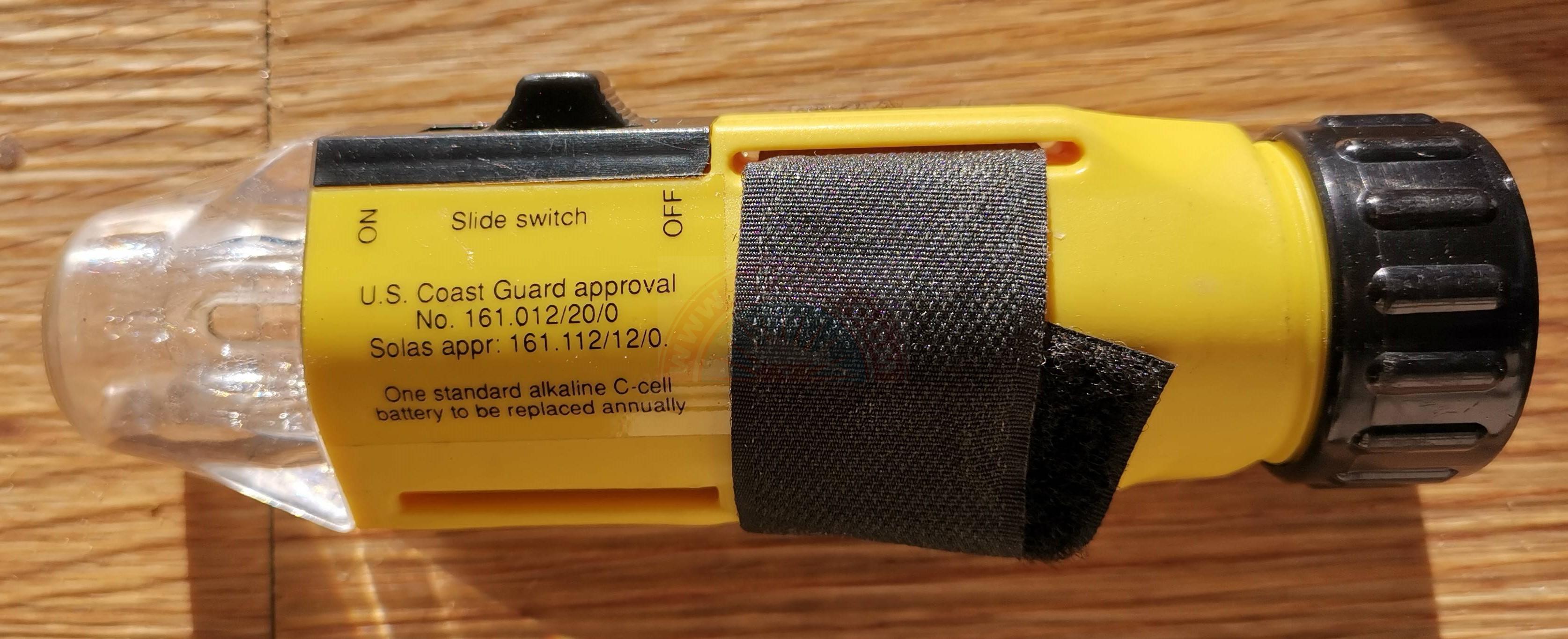 The PLB operates on 121.5 and 406 MHz. Its battery was scheduled for replacement in 07/2023 but a test indicates 100% (three flashes).