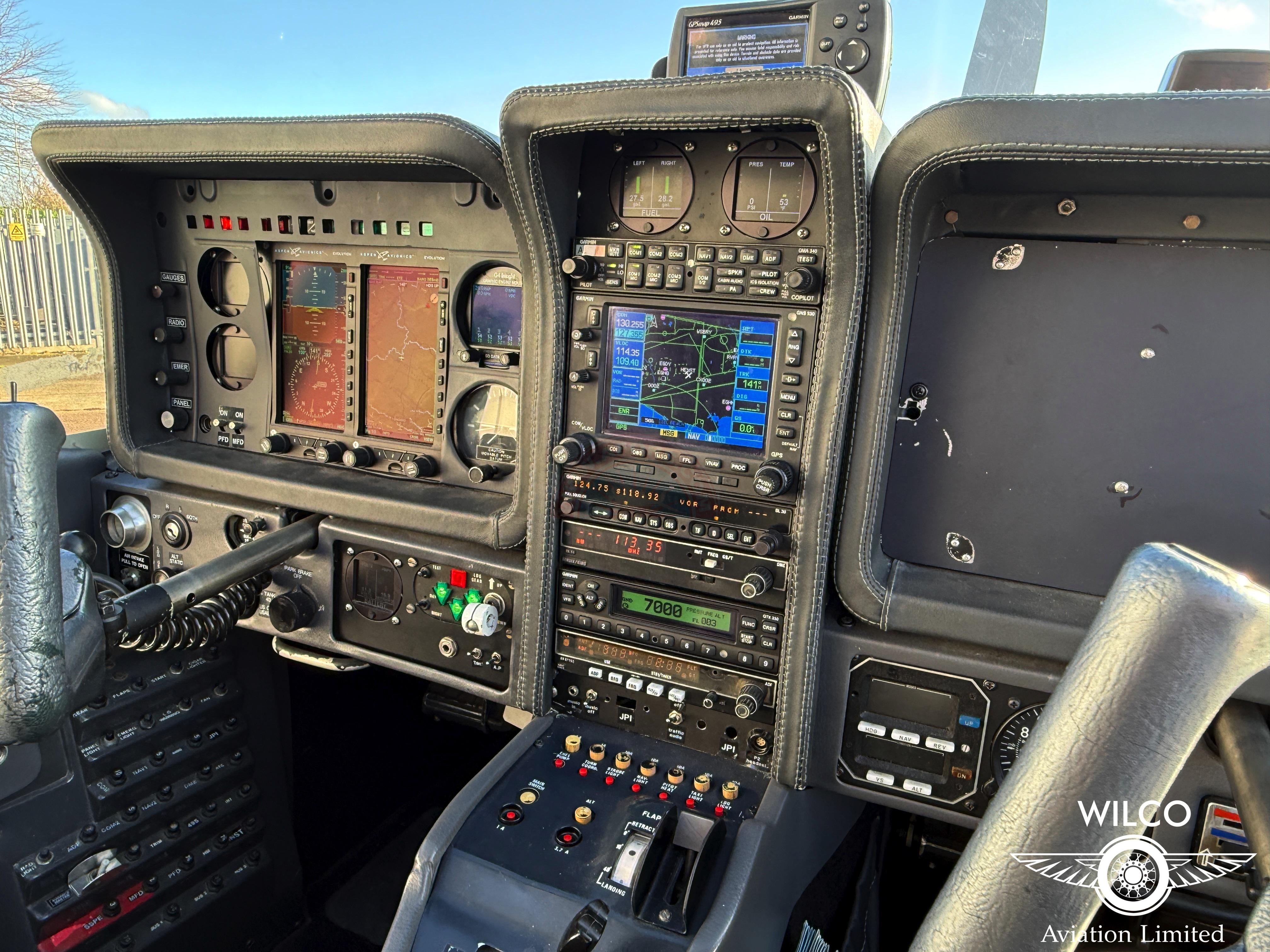 The avionics and equipment fit of N5ZY is both comprehensive and well balanced, offering a capable and reassuring cockpit environment for VFR and IFR operations alike. At the heart of the panel are the Aspen EFD 1000 Primary Flight Display and Aspen EFD 1000 Multi-Function Display, providing a clean, modern presentation of essential flight, navigation and situational awareness information. These displays significantly reduce pilot workload while enhancing clarity and redundancy compared with traditional analogue instrumentation.
