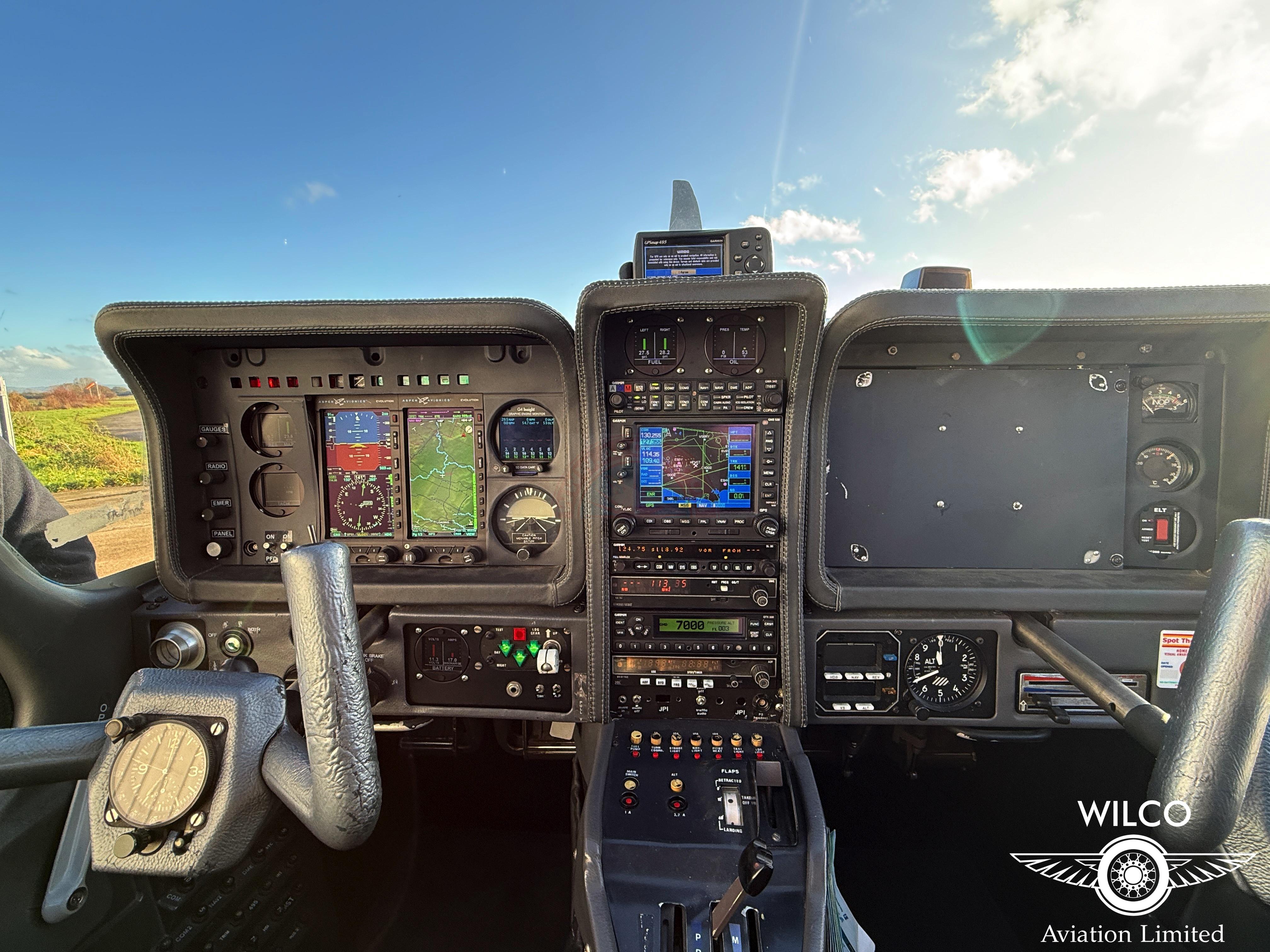 Navigation and communication capabilities are centred around the Garmin GNS 530W GPS/NAV/COM, which is WAAS-enabled and compliant with 8.33 kHz channel spacing, making the aircraft well suited to modern European airspace and IFR procedures. This is complemented by the Garmin SL30 NAV/COM, providing additional flexibility and redundancy. Audio management is handled by the Garmin GMA340 audio panel, delivering clear radio and intercom audio for both pilot and passengers.