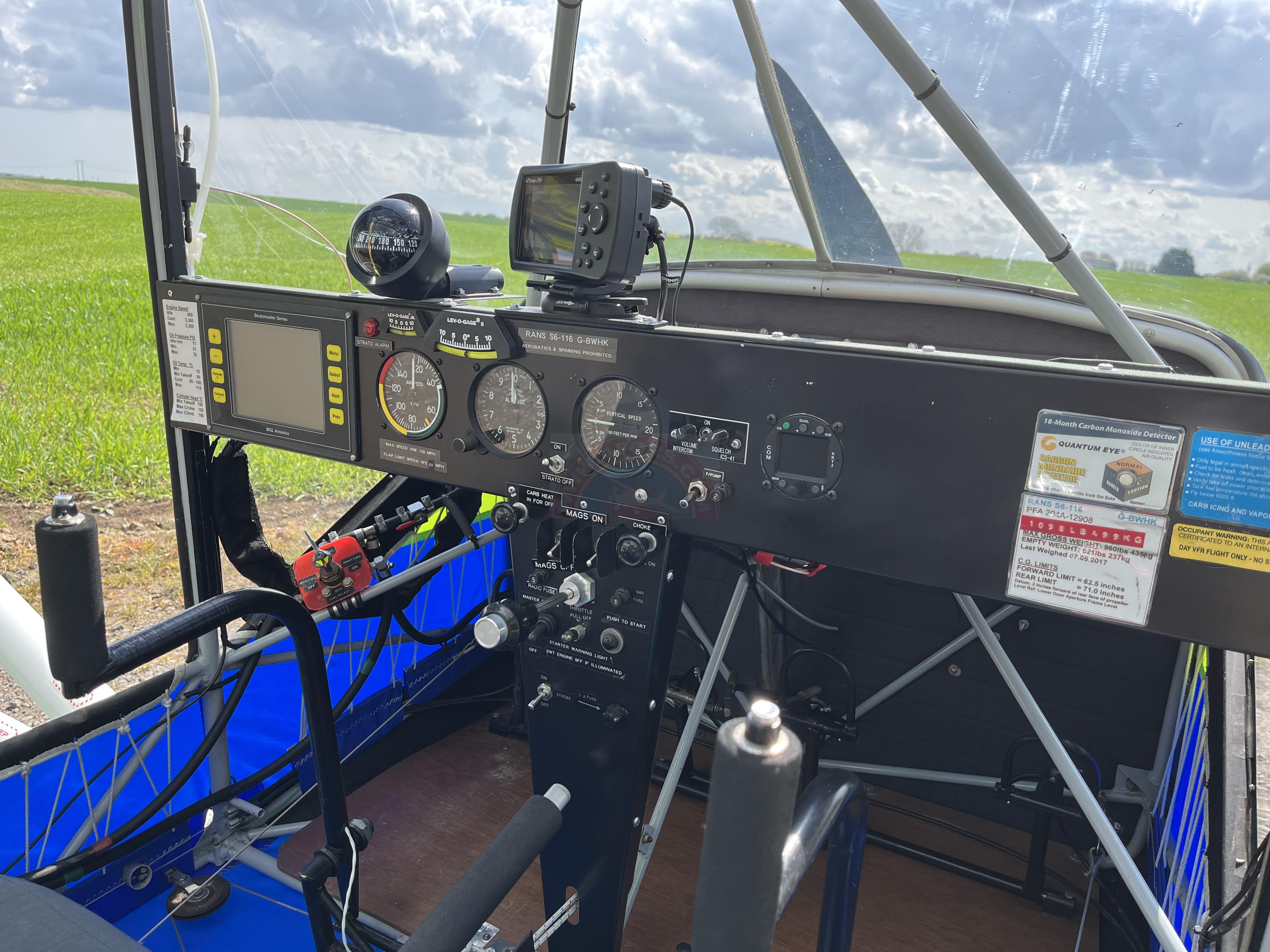 Cold start coil, MLG Stratomaster, 8.33 radio, plot aware, CO detector, Garmin 296.